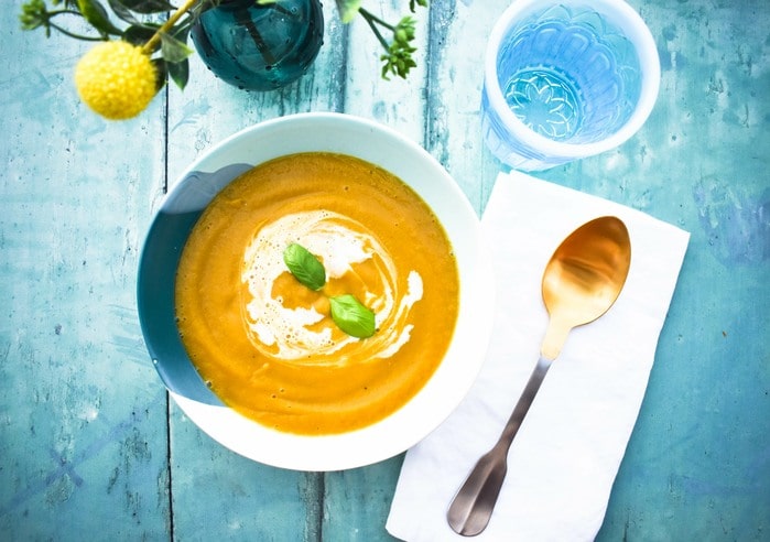 Add chopped herbs to the pre-blended soup and you will have gorgeous little pops of green colour in your bright orange soup.