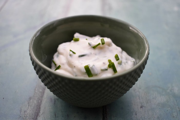 It's a super creamy dip with some tang from the lemon and a soft oniony flavour from the chives.